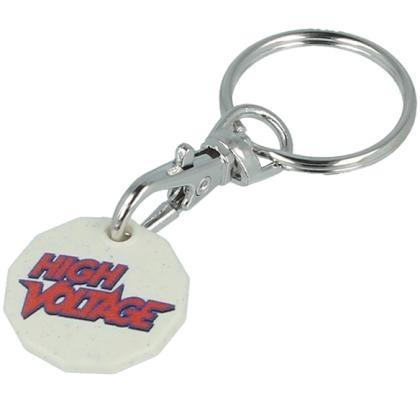 100% recycled plastic trolley coin key ring with snap hook fitting. Made in the UK from recycled plastic and digitally printed in full colour as standard.