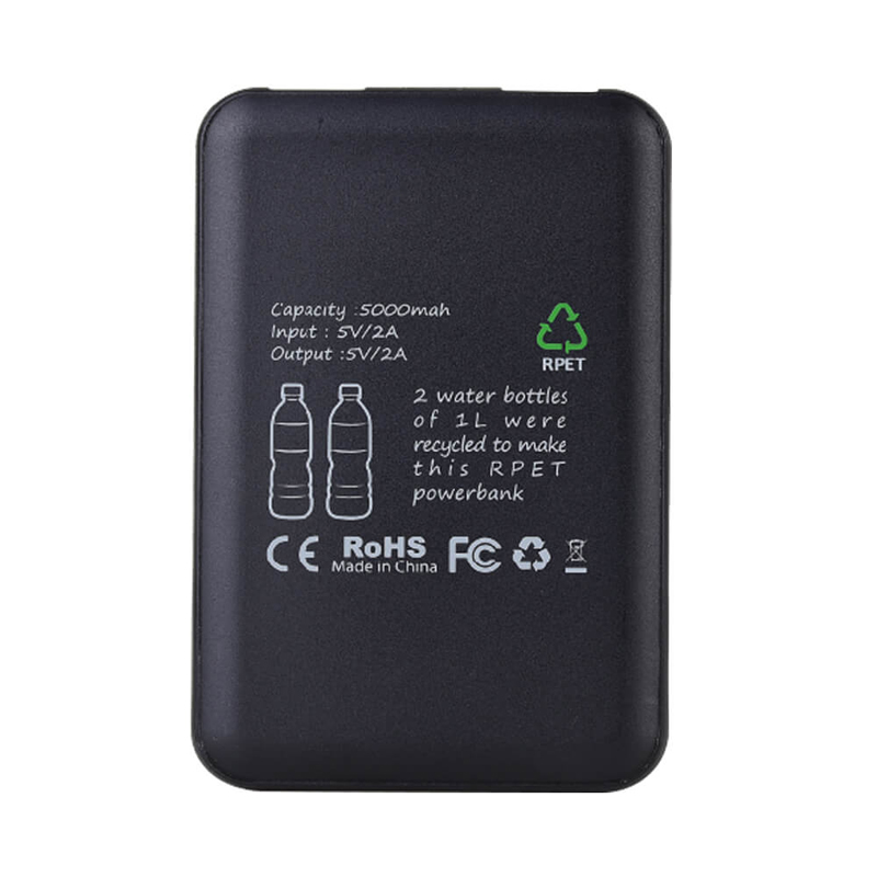 5000 mAh power bank made from recycled water bottles, supplied in black and grey fabric. The product is also used antimicrobial plastic certified by SGS. Packed in a kraft box.