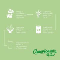 Double-wall insulated tumbler with screw-on lid and 350 ml capacity. Contains 25% plastic derived from sugar cane. This renewable source absorbs carbon dioxide whilst growing and is a by-product of the sugar industry. The use of sugar cane means less oil is used in the manufacture of each tumbler. The tumbler is 100% recyclable and packed in a home compostable bag. Made in the UK. BPA-free. EN12875-1 compliant, dishwasher safe, and microwave safe. 75% PP Plastic and 25% Sugarcane bioplastic.
