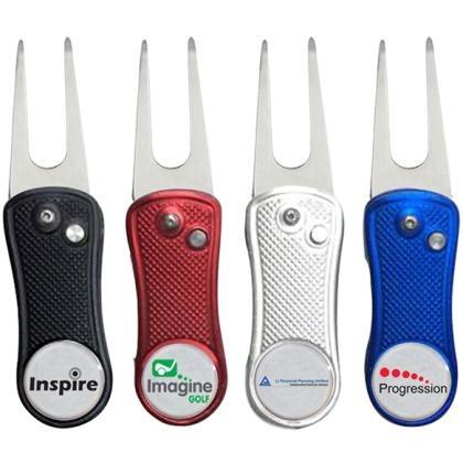 Amazing alloy metal flick tool with automatic retractable fork legs and a textured finish for a sure grip. A smooth finish rear to the fork for comfort and a removable 23mm diameter metal magnetic marker printed full colour and domed.