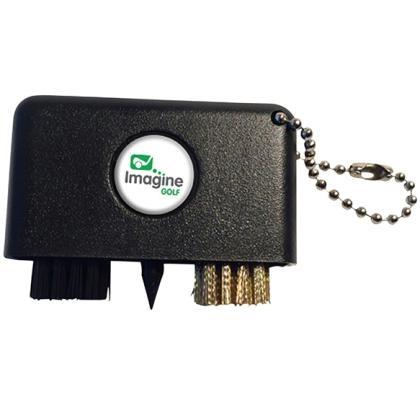Great black brush tool with three brushes for cleaning a golfer’s spikes or other equipment and accommodates a full colour printed domed label with a silver chain for attachment to golf bag.
