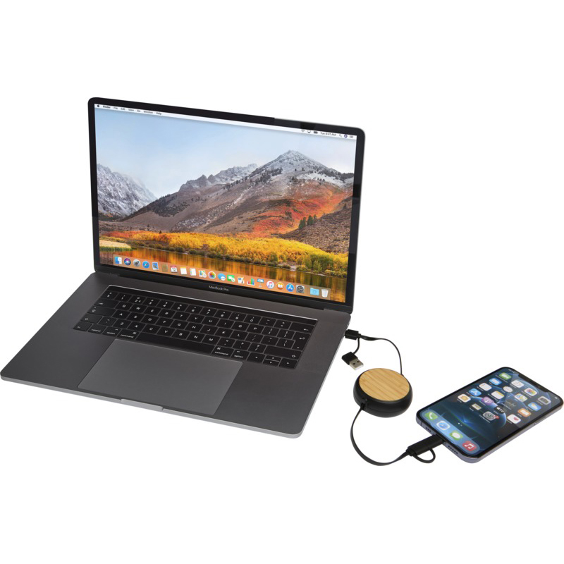 The Chechia 5-in-1 retractable data sync and 45W fast charge cable is made from recycled plastic accented with responsibly sourced bamboo.