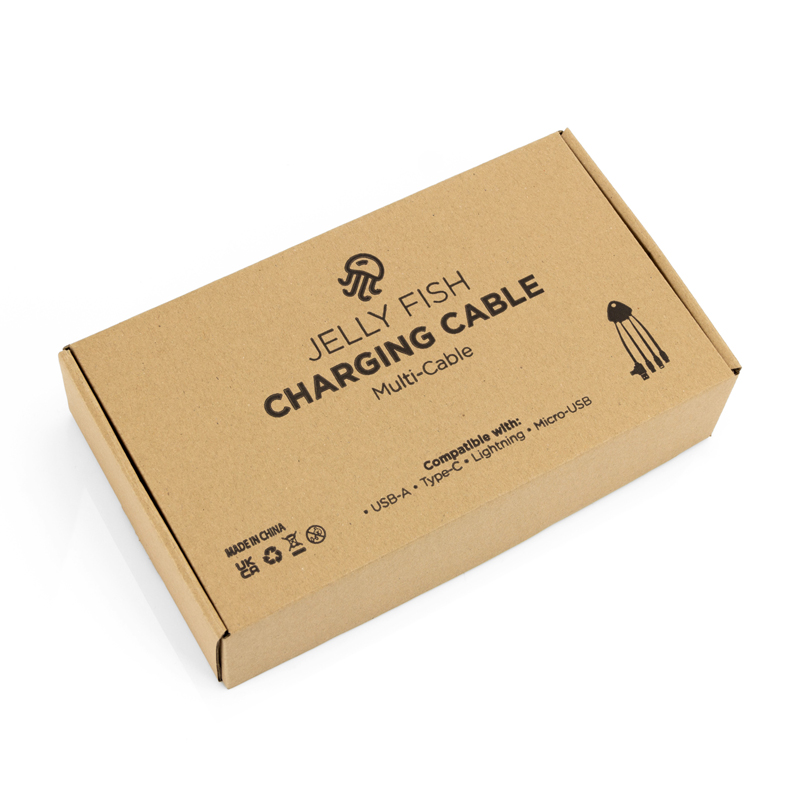 No matter the device, the ECO Jellyfish charger will keep you charging! Featuring Type-C, Lightning and Micro-USB connectors, you will be able to charge a wide range of devices- simply plug into a certified charger or computer to start charging your devices. Each of the Jellyfish’s cable arms are between 88 – 92mm, with the USB and Type-C arm being 1 metre long. The 1 Metre long cable arm will come coiled up with a twist tie to ensure it is kept compact for shipment and transport. MOQ: 50 units.