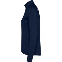 Long-sleeve technical raglan sweatshirt for women. Slim-fit. Collar with a half zip inverted design featuring reflective details. Reinforced seam covers. Cuffs with thumb openings. Reflective details on the back. Back hem slightly longer than the front. Warm brushed inner fabric. Knit of 88% Recycled Polyester and 12% Elastane, 200 g/m2.