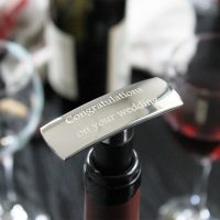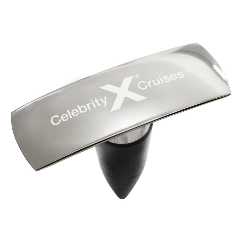 Chunky polished wine stopper with larger engraving area and rubberized lower section.