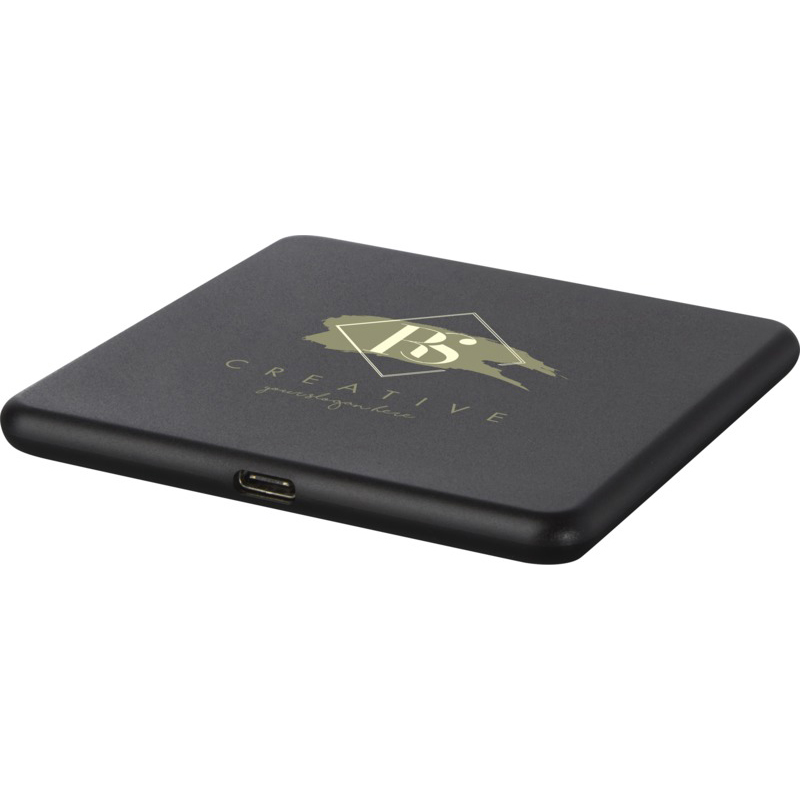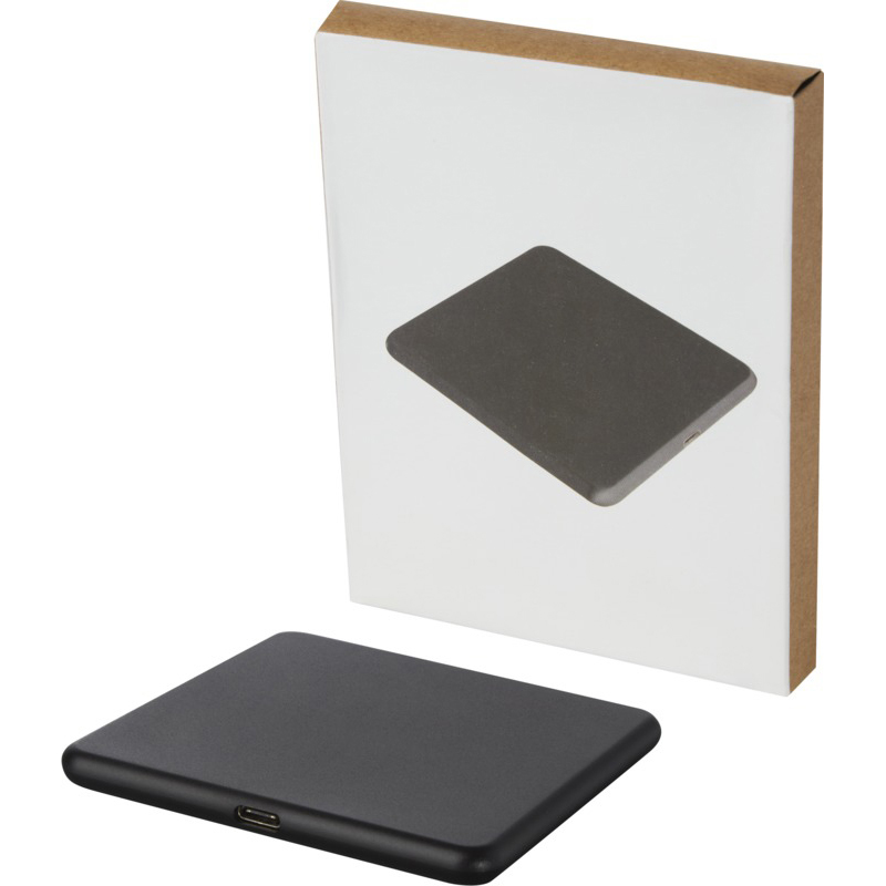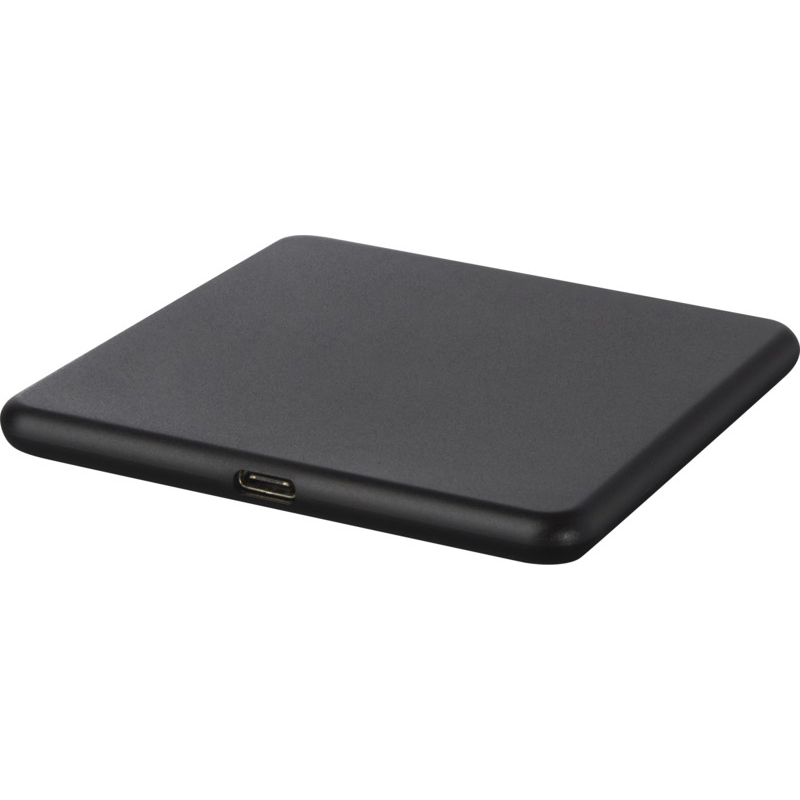Wireless charging pad made of recycled ABS plastic. Connect the charging pad to a computer or laptop and place the device on top to start charging. Wireless output is 10W (max) for quick charging. Compatible with all Qi devices (iPhone 8 or above and Android devices that supports wireless charging). Delivered in a gift box with an instruction manual (both made of sustainable material). Recycled ABS Plastic.