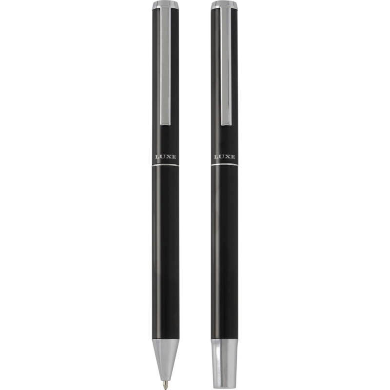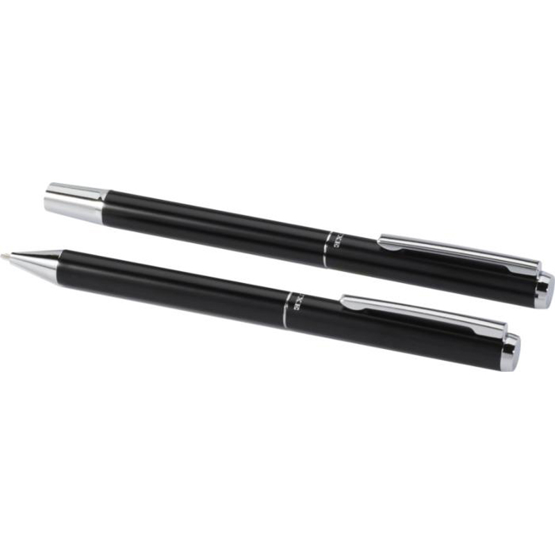 The pen barrels in this ballpoint and rollerball pen set are made of matte coloured anodized recycled aluminium with shiny chromed accessories.