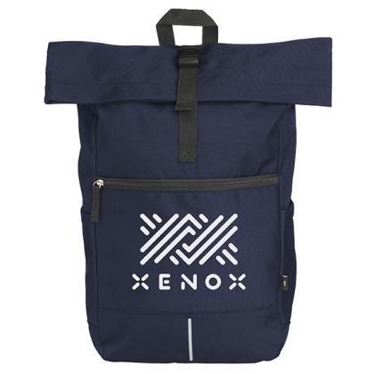 Practical, sturdy and water-resistant ‘roll-top’ backpack made from rPET Polyester (made from recycled PET bottles). The backpack has a large inner compartment with a special laptop compartment (up to 15.4”). Zipper pocket on the front with a reflective highlight below it (improving visibility in the dark). With 2 side pockets, foam back and padded, adjustable shoulder straps for increased wearing comfort, carrying strap and handy roll closure with click system at the top. The perfect bag with a minimal ecological footprint, for daily use. Capacity approx. 20L.