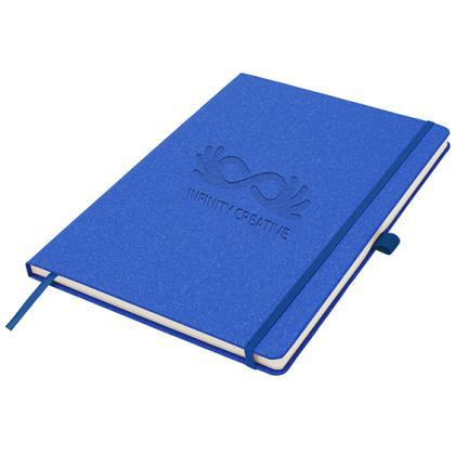 Sustainably-sourced A4 notebook in five colours. The cover is manufactured from recycled certified board and covered with thermal paper to enable your logo to be debossed, avoiding the need for ink. Supplied with 196 pages of 80gsm Ivory lined certified paper and a colour matched ribbon, pen loop and elastic closure.