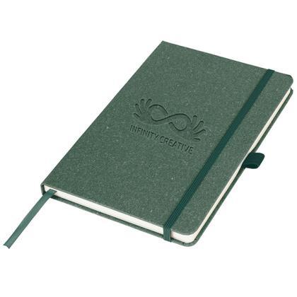 Sustainably-sourced A5 notebook in five colours. The cover is manufactured from recycled certified board and covered with thermal paper to enable your logo to be debossed, avoiding the need for ink. Supplied with 196 pages of 80gsm Ivory lined certified paper and a colour matched ribbon, pen loop and elastic closure.