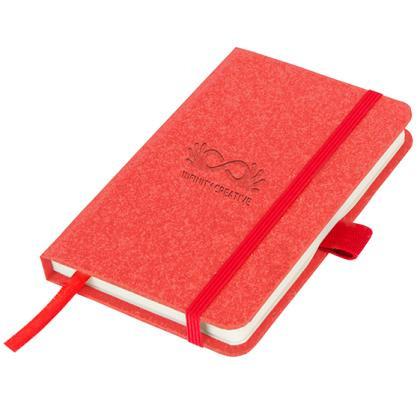 Sustainably-sourced A6 notebook in five colours. The cover is manufactured from recycled certified board and covered with thermal paper to enable your logo to be debossed, avoiding the need for ink. Supplied with 196 pages of 80gsm Ivory lined certified paper and a colour matched ribbon, pen loop and elastic closure.