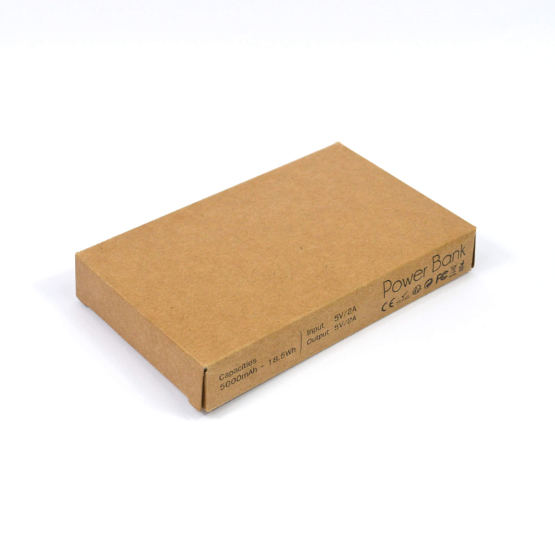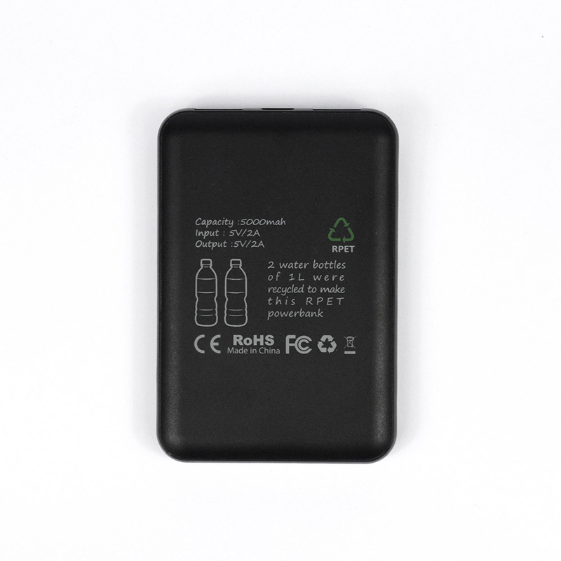 Eco Power Bank: Two 1L water bottles were recycled to make this rPET 5000mAh power bank. The branding on this power bank is LED light up logo and comes supplied in a kraft box.