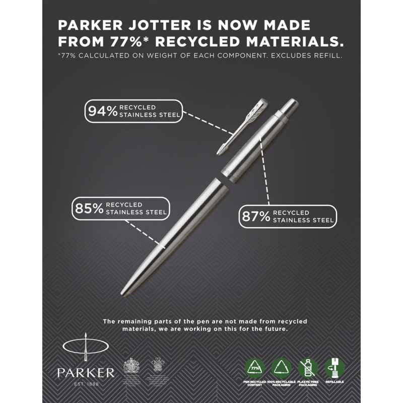 Jotter ballpoint pen. Jotter stands as an authentic design icon of the last 60 years. With covetable colours and a distinctive shape Jotter remains Parker’s most popular pen, recognizable down to its signature click. Incl. Parker gift box. Delivered with patented QuinkFlow ballpoint refill. Exclusive design. Stainless steel.