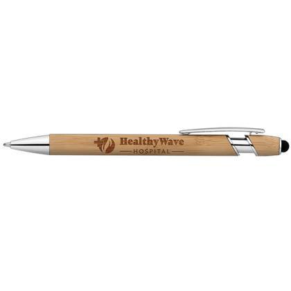 Promote your business with the new addition to our best-selling Prince Pen collection. This ballpoint pen a bamboo barrel sourced via responsible forestry for an earthy look and smooth feel, and your logo is laser engraved for long-lasting visibility. Your recipients will appreciate the convenient stylus for use on touchscreens. This pen, and your branding, promise to hold a prominent position on desks and in hands throughout the year.