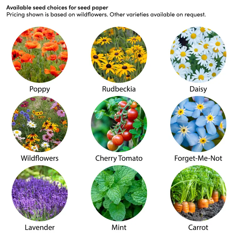 The seed paper is exceptionally versatile, making it a perfect fit for garden beds, flower pots, and planters. Just plant, water, and watch your flowers grow. Paper Dimensions: 200 x 50mm. Paper Weight: 220gsm.