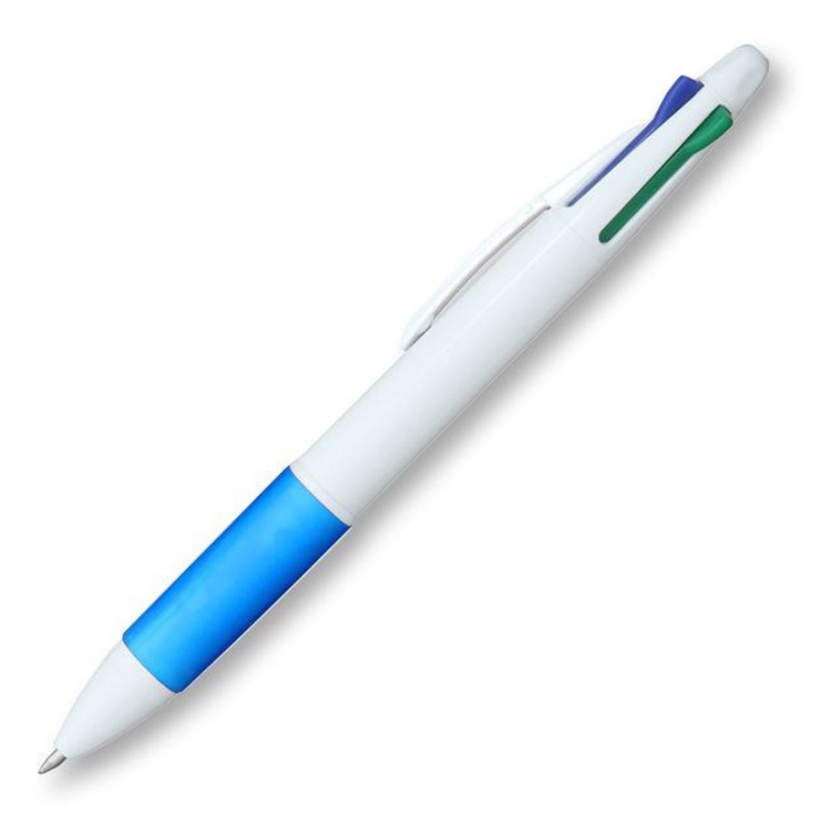 Made from recycled plastic, this 4-in-1 pen features black, blue, red, and green ink colours. Like the highly successful Tetra, made from virgin plastic, it offers the same extensive print area on its white body. Equipped with black and blue comfort grips, it ensures a smooth and comfortable writing experience while promoting sustainability.