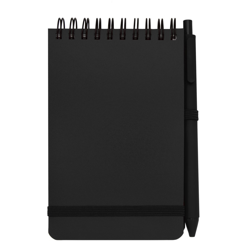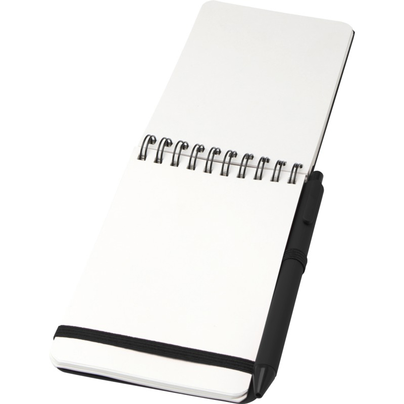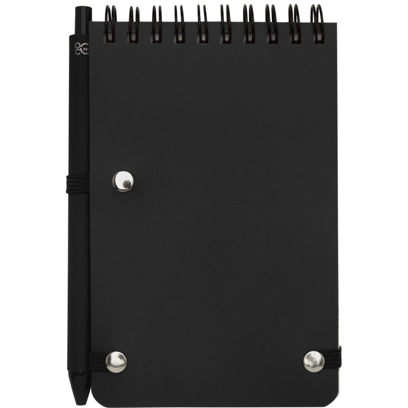 The Thalaasa A6 hard cover notebook is made of ocean bound recycled plastic with 80 lined sheets of 70 g/m² cream coloured paper. The notebook has rounded corners, an elastic closure, and a pen loop. The ballpoint pen with black ink is also made of ocean bound recycled plastic. Writing length: 1000 metres. Nib size: 1.0 mm. FSC certified paper.