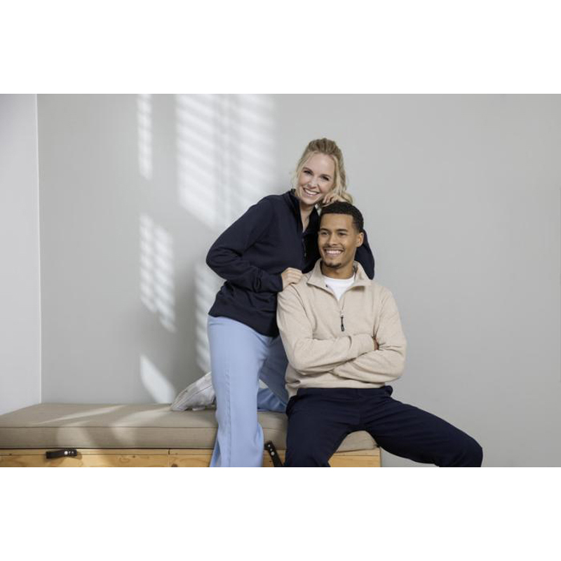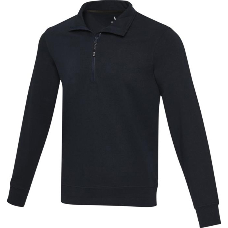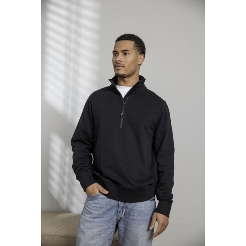 The Tin unisex Aware™ quarter zip sweater is made from 280 g/m² 50% recycled polyester and 50% recycled cotton.
