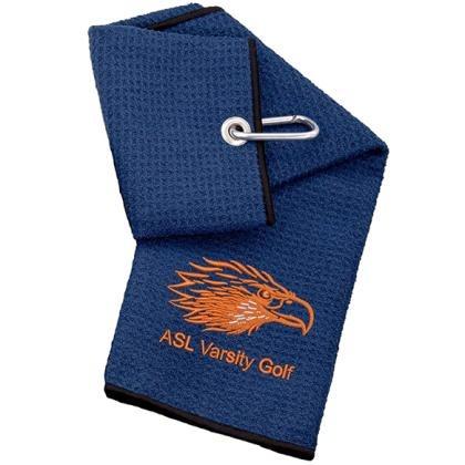 100% polyester microfibre Tri-fold golf towel with a waffle finish. Complete with a quality carabiner clip. 420gsm, Machine washable, 40cm x 50cm full size, folding is approx. 13cm Width. In-house embroidery services are available. MOQ: 1.