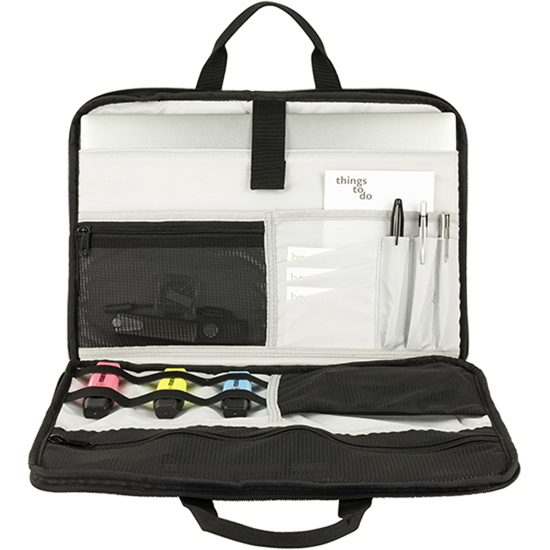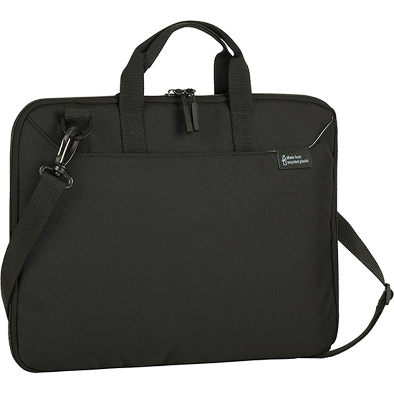 PC Bag made from 600 x 600d rPET fabric, padded laptop compartment for 15.4 PC , interior 210d rPET with mesh accessory &; zipped organizational pockets, carry handles & shoulder strap. Front slip pocket.